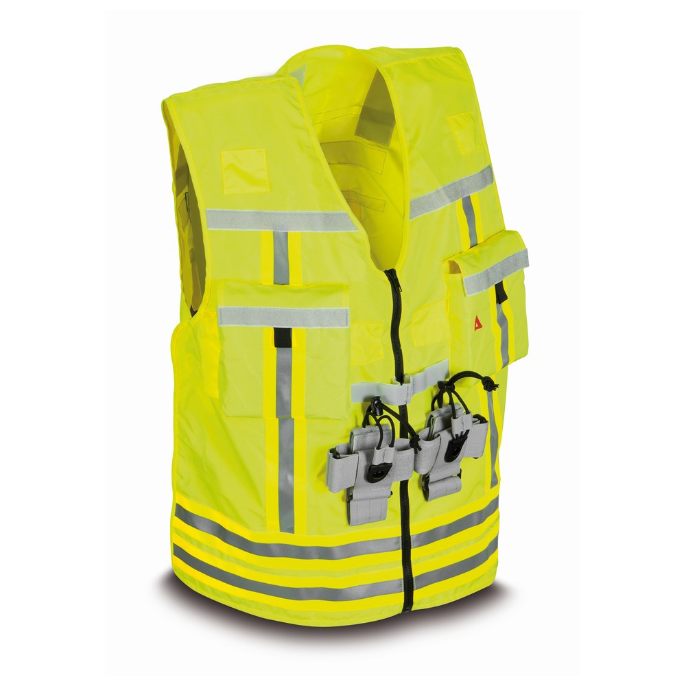 Diese Kennzeichnungswesten verfügen über zwei Funkgerätehalterungen mit längenverstellbaren Sicherungsschlaufen, Halteschlaufen für die Antennen sowie Klemmschlaufen für die Mikrofone im Schulter- und Brustbereich. Zwei Brusttaschen für DIN A6 Notizblöcke und Brust- und Rückenflausch für Klettschilder sind ebenfalls vorhanden. Auf dem Rücken können zwei Klettschilder (40 x 8 cm) befestigt werden, der Brustflausch misst 12 x 2,5 cm. Die Weste wird mittels Klett am Jackenflausch gehalten. Der Umfang der Weste ist regulierbar. Zudem ist die Weste nach EN 533 flammhemmend ausgerüstet.