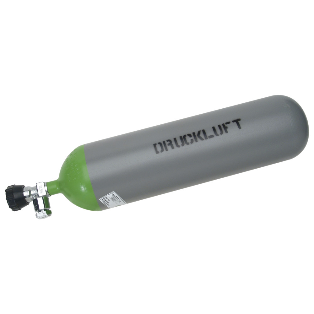 Druckgasflasche zum Befüllen von Pneumatikzelten, Betrieb von pneumatischen Pumpen, Plasmaschneidgeräten etc.. Stahlflasche mit Drehventil und Verschlussstopfen. Die Flasche wird leer geliefert.
