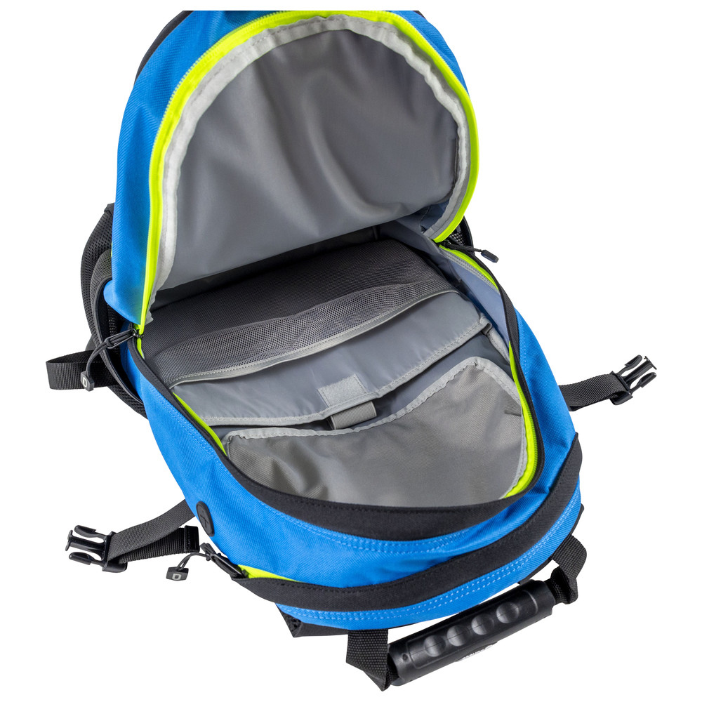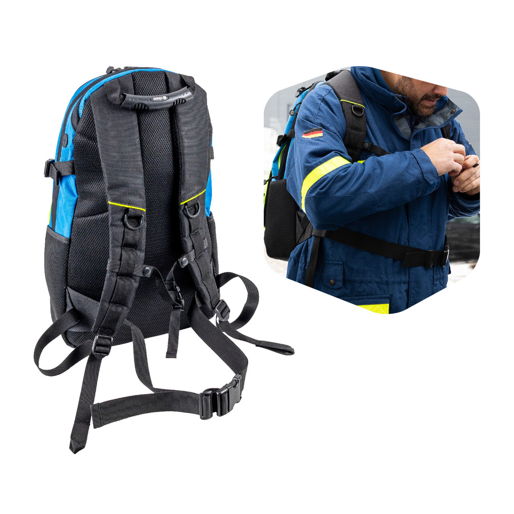 - Vorne drauf: Gurt zum Anhängen größerer Gegenstände, z. B. Einsatzhelm, Yoga-Matte, etc.