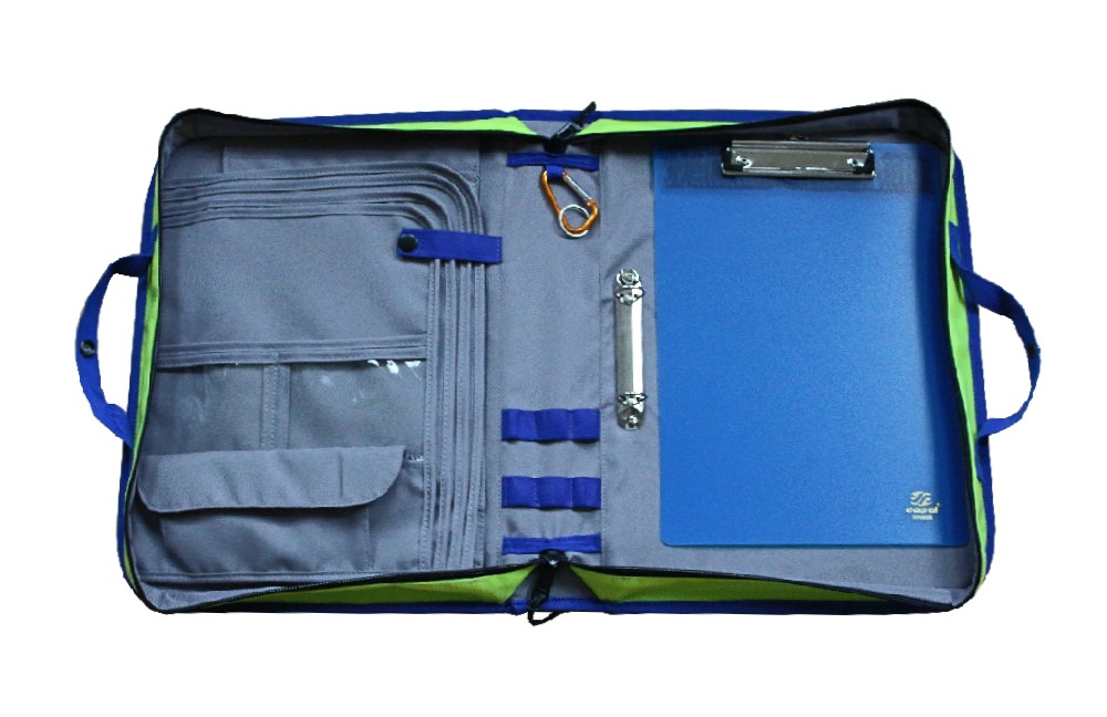 - Einschub- und Klarsichtfächern, Klettverschlussfach, Stiftehalterung, Tablet-Halterung