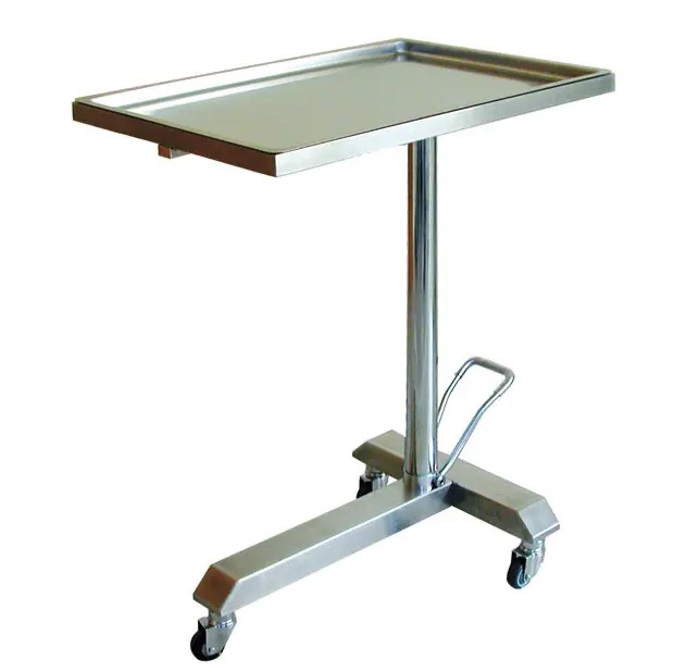 Mit Hydraulik-Fußpumpe zur Höhenverstellung. Komplett hergestellt aus rostfreiem Edelstahl, mit abnehmbarem Tablett. Mit 3 antistatischen Rollen (Ø 50 mm) und Bremsen. Höhenverstellbar: von 900 bis 1250 mm