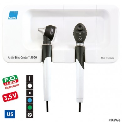 KaWe MedCenter® 5000 Set bestehend aus: - Grund-/ und Ausbaumodul mit 2 Griffen - KaWe PICCOLIGHT® Otoskop-Kopf F.O. LED high power, night, 3,5 V, REF 01.73550.021 LED-Beleuchtung mit 3-facher Lupenvergrößerung, Otoskop-Leuchtmittel: LED-Lampe Nr. 12.75253.003 - KaWe PICCOLIGHT® Ophthalmoskop-Kopf E56 (US), night, 3,5 V, REF 01.87566.021 mit Korrektionslinsenrad stufenweise von +20 bis –20 Dioptrien, 6 Blenden, Ophthalmoskop-Leuchtmittel: Xenon/Halogen-Lampe REF 12.75232.003 - ALL in ONE: wechselbarer Netzstecker 230 V (EU-Version), 110 V (US-Version), 240 V (GB-Version) - Wandmontage-Set bestehend aus: 1 x Aufhängevorrichtung, 5 Schrauben mit Dübel