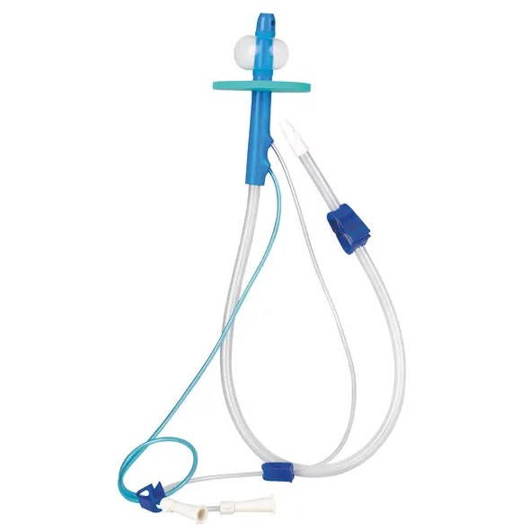 Hier haben Sie alle Vorzüge in einem Darmrohr vereinigt: flexibles, weiches Darmrohr mit zentraler und 2 seitlichen Öffnungen, flacher Latexballon mit innenliegender Luftzuführung. Die weiße Schaumstoffplatte ist zwischen Anus und Sphinkter verschiebbar, um einen optimalen Abschluß zu erzielen. Ein Sicherheitsgebläse ist fest angeschlossen, so daß eine Ballonüberdehnung vollkommen ausgeschlossen ist. Max. 100 ml Luft. Die blau codierte Luftleitung für den Doppelkontrast hat einen Trichter-Konnektor für den Anschluß des Luftgebläses.