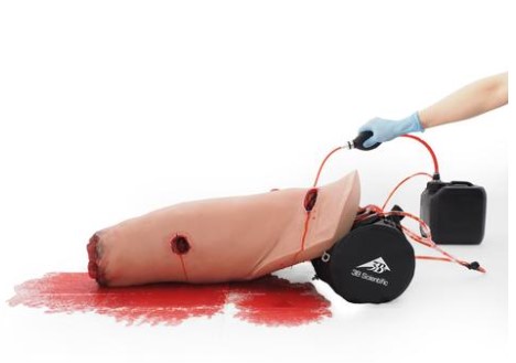 Ein manuelles Blutpumpensystem liefert Kunstblut einzeln an jede Wunde, an zwei ausgewählte oder an alle drei Wunden zusammen. Verschiedene Szenarien venöser oder arterieller pulsierender Blutungen lassen sich einfach und realistisch simulieren. Die Schulungsteilnehmer erhalten ein direktes visuelles Feedback (Blutungsstillung durch mechanischen Verschluss), wenn die gewählte Technik zur Blutungskontrolle korrekt angewendet wurde.